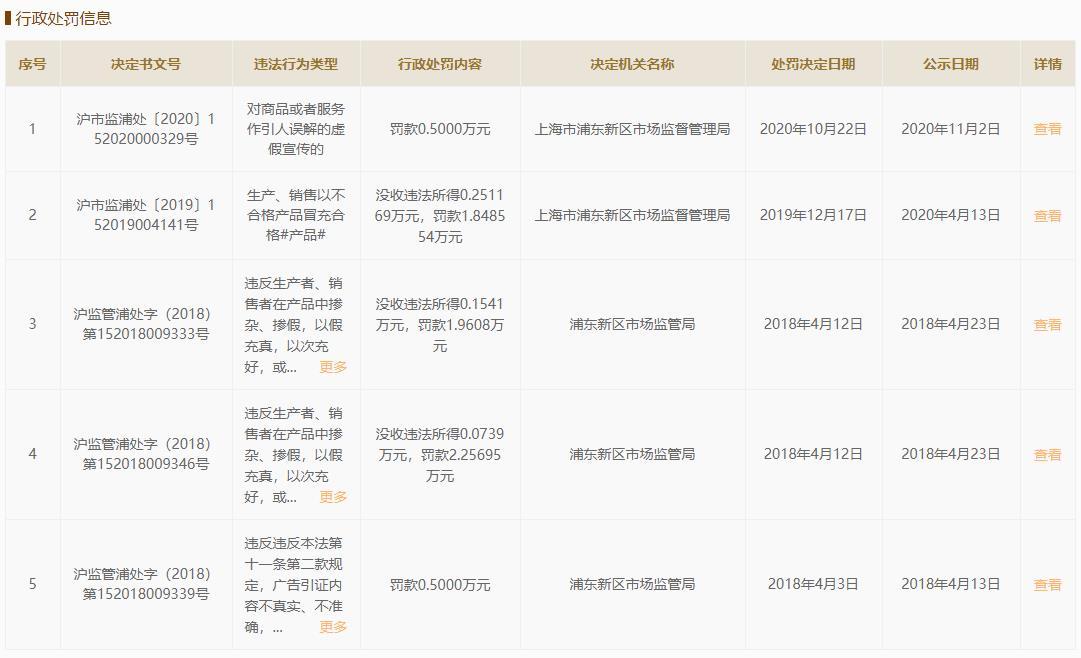 国家企业信用信息公示系统网站同时显示,2018年4月至今,美邦服饰已5次收到市场监管部门作出的行政处罚决定,其中3次包含“生产、销售以不合格产品冒充合格”,其余2次为广告或宣传不规范。