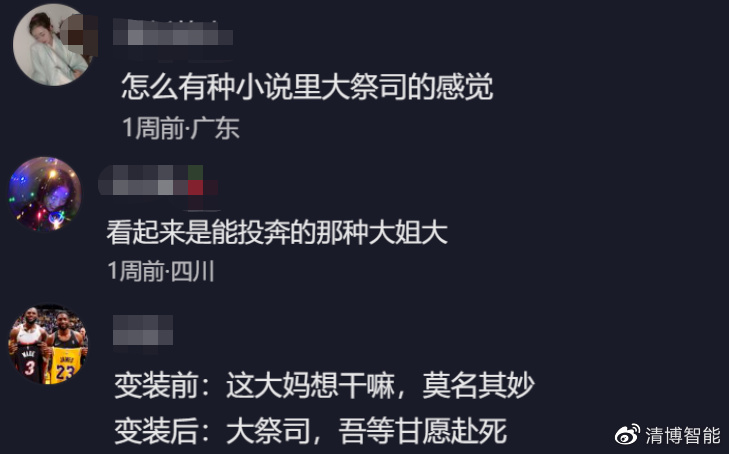 在这13W评论中,不少有才网友脑海中已经脑补出一部部大女主小说了,比如:“变装前:这大妈想干嘛,莫名其妙;变装后:大祭司,吾等甘愿赴死。”