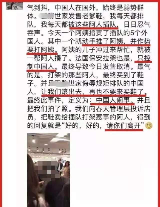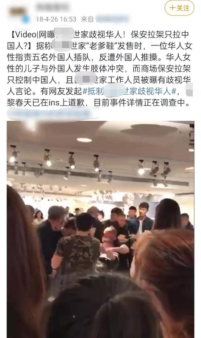 更有在现场的华人爆料,当时某某世家的员工还有歧视中国的言论,让中国人滚出去,再也不要来买鞋了,并且这件纠纷最终被定义为“中国人闹事”。