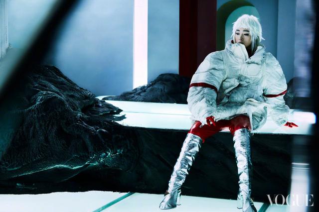 在《服饰与美容Vogue》十月刊封面故事的拍摄中,编辑团队在200多件从世界各地调来的高定时装、设计师时装中选定了5套服装,打造未来感十足的造型。不仅有科幻感十足的太空服外套,也根据银色与金色面料的服装呈现时装造型。拍摄所打造的场景,结构感强烈。巩俐第一次以白发造型拍摄杂志封面,她斜倚在黑色的岩石上,眼睛直视着镜头,仿佛是来自未来世界的凝视,张力十足,穿透时空。