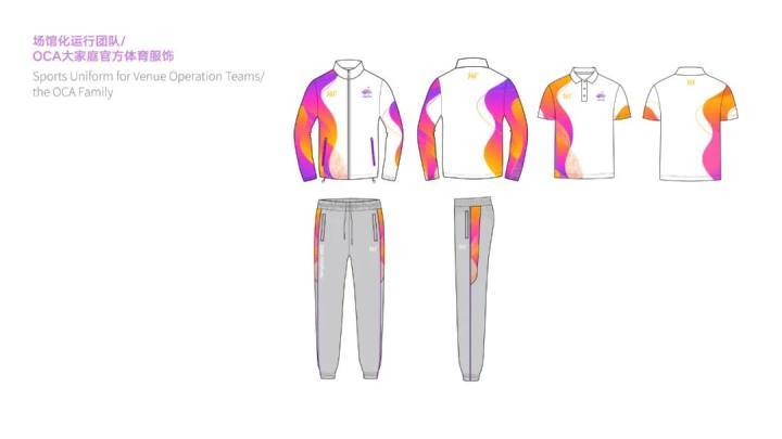 杭州亚运会官方体育服饰包括:火炬手官方体育服饰、护跑手官方体育服饰、赛会志愿者官方体育服饰、技术官员官方体育服饰、安保人员官方体育服饰、技术官员正装服饰、场馆化运行团队/OCA(亚奥理事会)大家庭官方体育服饰、OCA(亚奥理事会)大家庭正装服饰。
