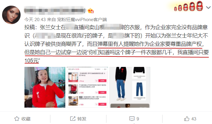 据网友透露,当时网友还以为张兰年纪大不认识牌子被供货商糊弄了,但随着弹幕里有人提醒她作为企业家要尊重品牌产权时,张兰反而是毫不在意的表示:“你们知道吗这个牌子一件衣服都几千,我直播间只要105元。”