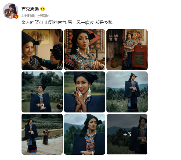 8月31日,吉克隽逸在个人社交平台发布彝族服饰写真,并配文:“亲人的笑容,山野的香气,眉上风一吹过,都是乡愁。”