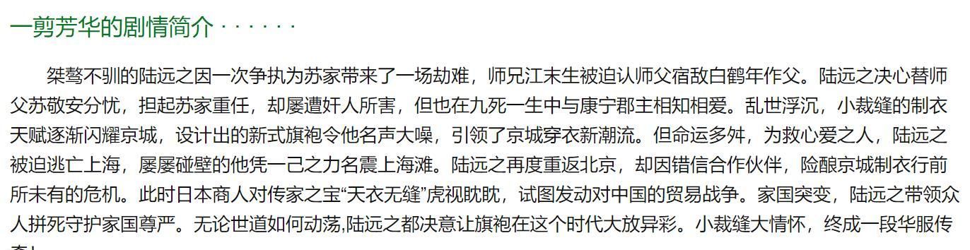 首先,题材得人心。这个剧的另一个名字叫《华服传奇》,也就是说,它讲述的不仅仅是一个裁缝的奋斗故事,一个行业的内部境况,它还聚焦在了旗袍,这一中国传统服饰的制作、审美以及传承上,从预告里,我们就能看到很多关于这方面的画面。
