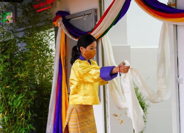 不丹女性的传统服饰在款式上是比较固定的,但是可以通过不同的颜色来变化出不同风格来。吉增佩玛王后都生了两个儿子了, 依然保持着很强的少女感。她的这身造型,选择了非常亮眼的金黄色,这次的活动,吉增佩玛王后是单独出席,没有国王子在身边,似乎心情也受到了影响。