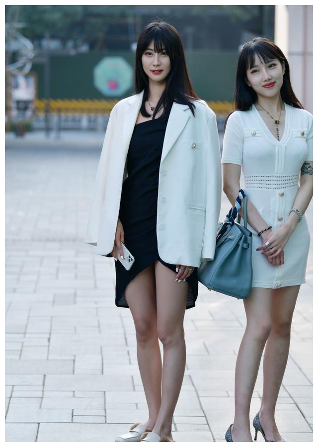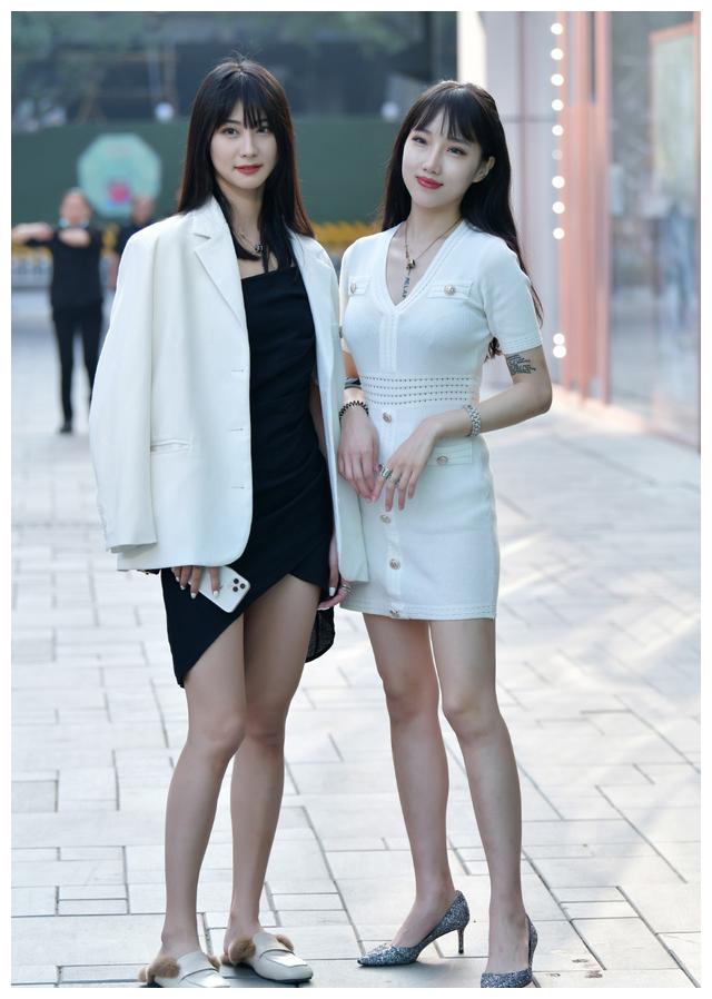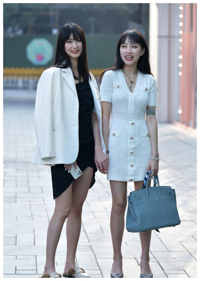 从两位闺蜜的穿搭来看,第一位小姐姐穿搭黑色裙外搭西装显得特别会穿搭,因为不管是黑色裙子穿着,还是在外搭白西装的基础上,都可以跟闺蜜的针织裙相互匹配起来,呈现出了清新优雅的美。然而不得不说小姐姐黑与白的搭配确实最有魅力的,最显气质的,清新中透着迷人的美。