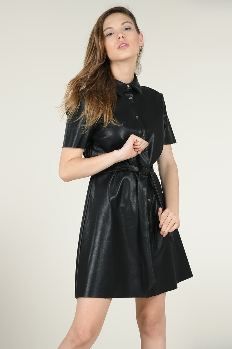 比如这款仿皮连衣裙,A字剪裁修饰身材又甜美,但是加上仿皮的材质,小野猫的气质有了~