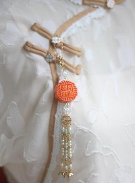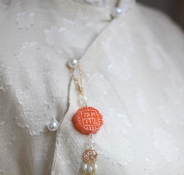 憨态可掬的小兔子看起来栩栩如生,形态逼真的月饼上还写着花好月圆几个字,看上去就非常具有中秋的气氛。在压襟的下面,也有三条珍珠流苏吊坠。大家无论是用这款饰品来搭配汉服,还是搭配旗袍,都是非常合适的。因为珍珠元素实在是太百搭啦~