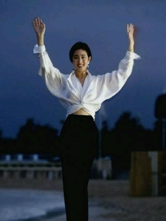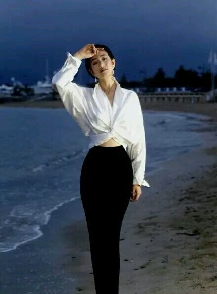 巩俐第一次去戛纳电影节在戛纳海滩的留影,白衬衣,高腰裤,简单,帅气,完美