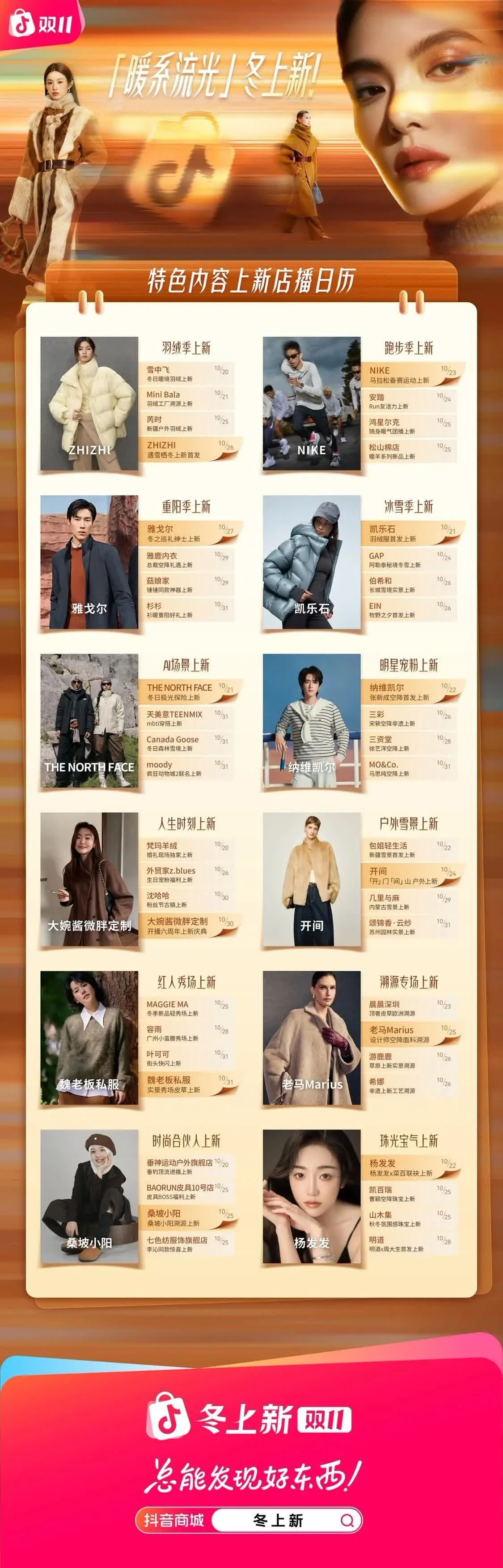抖音商城双11「冬上新」现已全面开启,在抖音商城搜索「冬上新」、「暖系流光」,发现冬日好新品。期待更多商家以丰富冬季新品,打开双11增长新空间。