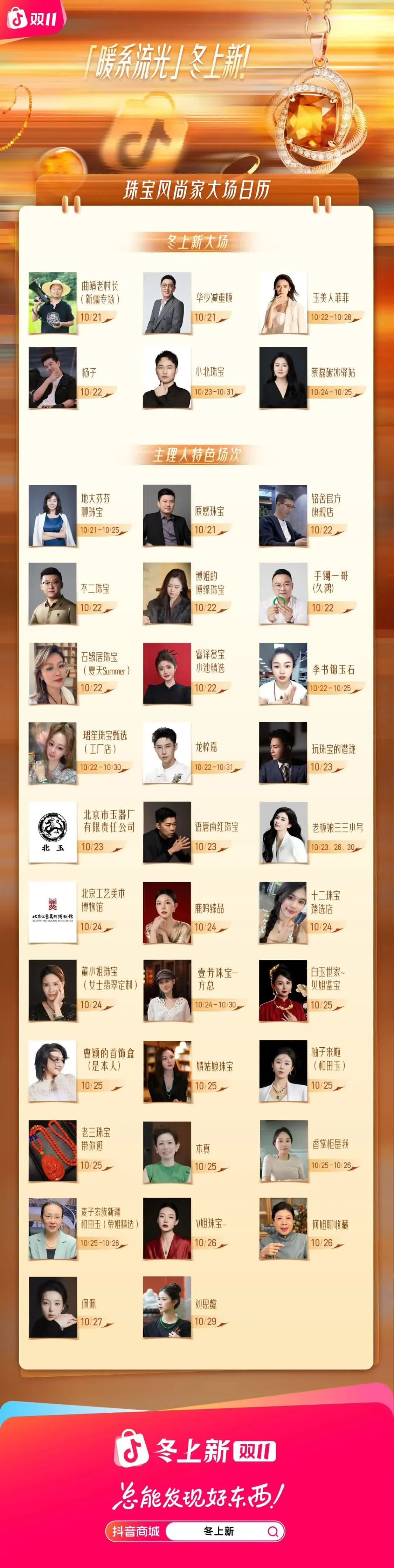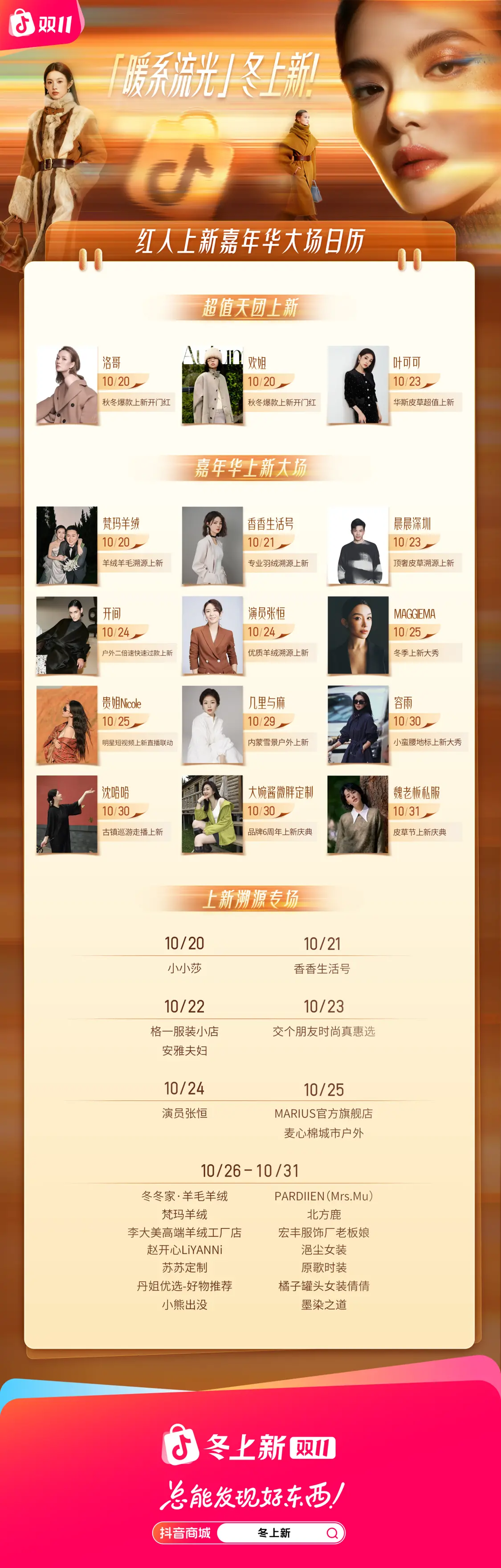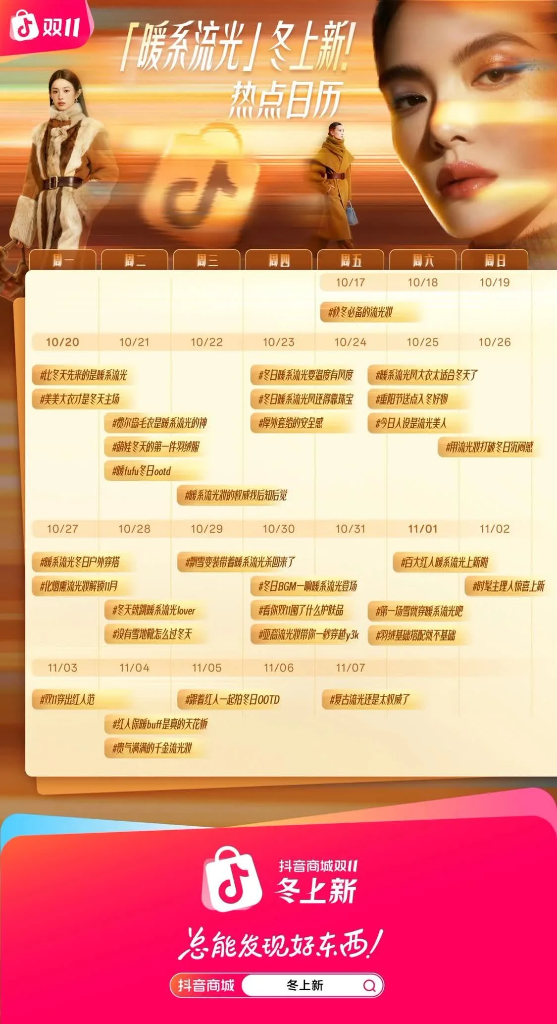 10月20日,「冬上新」联动明星@金晨、@徐艺洋、达人 @白昼小熊、@机智张、阿里北杯、@风信子 等共同演绎「暖系流光」主题,发布#比冬天先来的是暖系流光 热点首发即登热榜TOP1!#一秒入冬、#华东一秒入冬、#想问一下今年是没有秋天吗 等热点快速响应,带动服饰爆发。商家需紧跟平台内容节奏,针对金色系、温暖感货品做好SEO和搜索优化,获取丰厚流量激励。