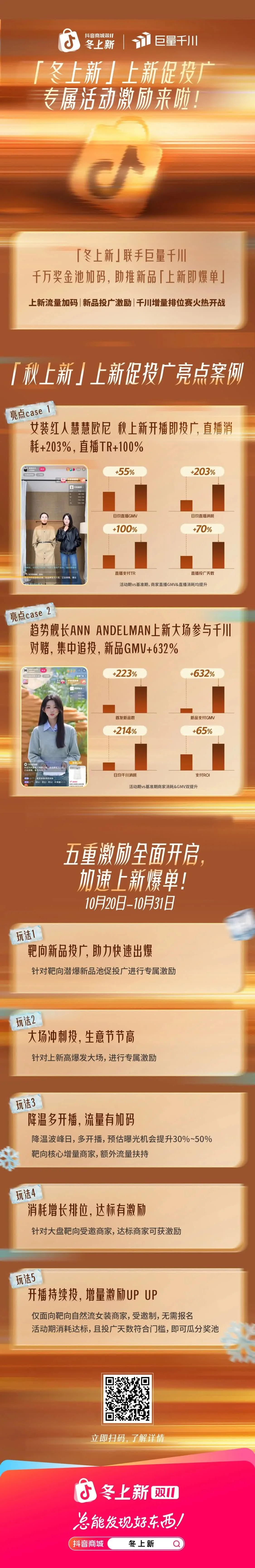 同时,「冬上新」继续联手巨量千川重磅加码千万奖金池,推出五大专属激励玩法。从新品投广、大场冲刺,到降温日开播、增量排位,玩法精准覆盖多元经营场景,助力商家实现“上新即爆单”。