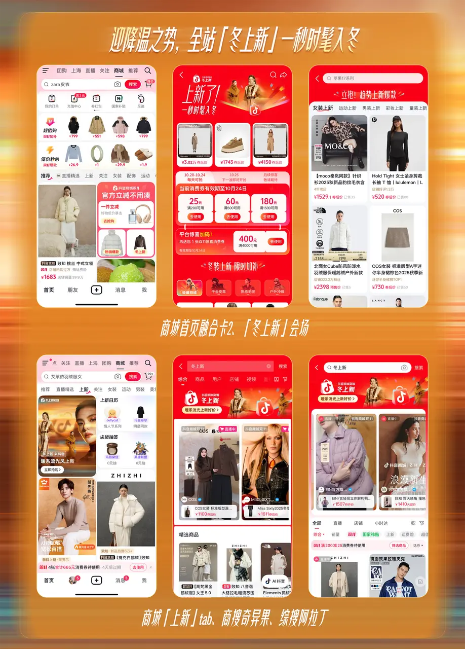 「冬上新」串联抖音商城推荐、搜索、店铺页、上新tab等多个场域,强化表达新品卖点、升级搜推流量机制,优质新品将获得更多曝光,大大提升转化效率。