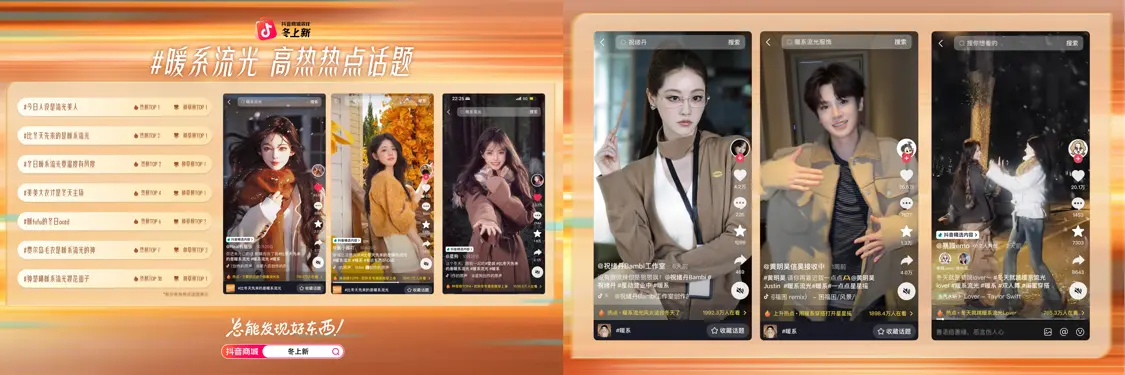 抖音商城双11「冬上新」延续秋上新「琥珀流光」热度,结合冬季保暖类目推出「暖系流光」,让商家的“保暖”新品找到“组织”,更快链接用户需求。#今日人设是流光美人、#比冬天先来的是暖系流光 等30个热点带动趋势品类热度,祝绪丹、黄明昊等200余位明星达人参与共创,将影响力进一步放大,总曝光超20亿。